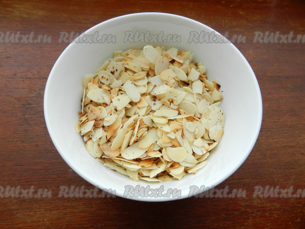 Миндаль обжарить в сковороде без масла до слегка золотистого цвета.