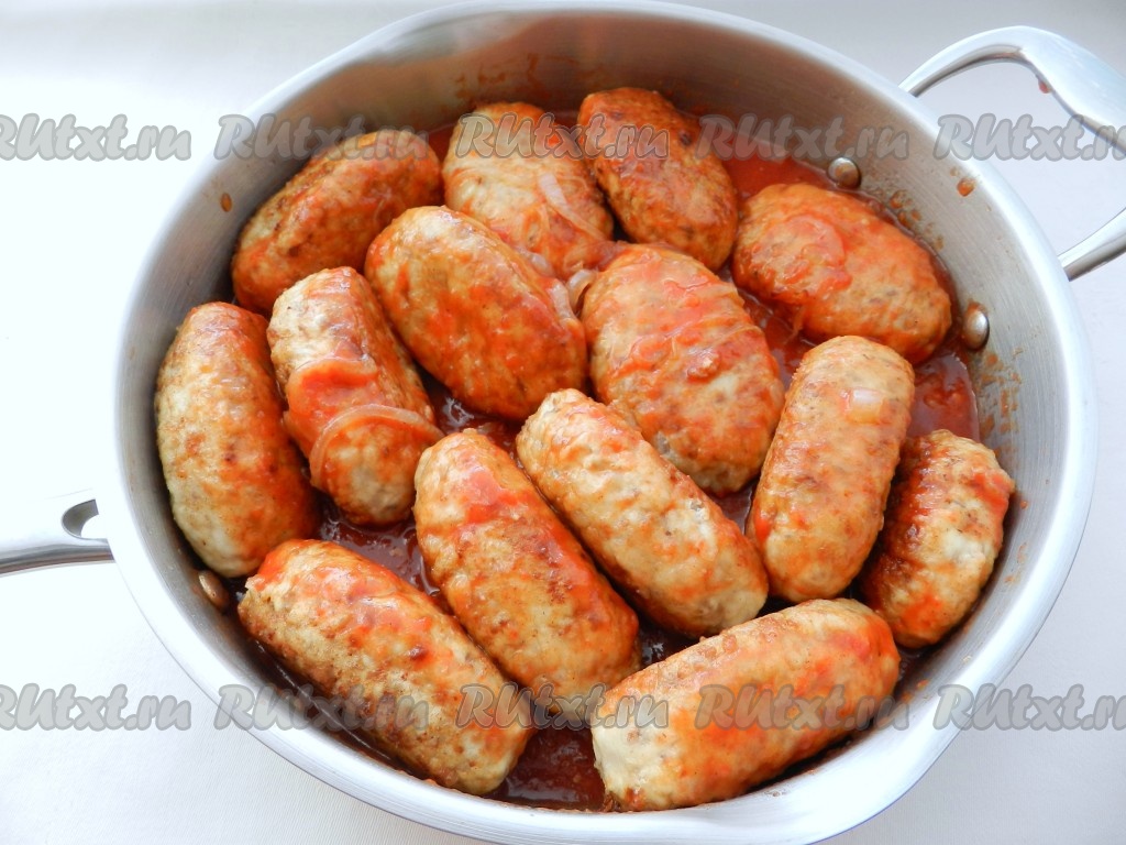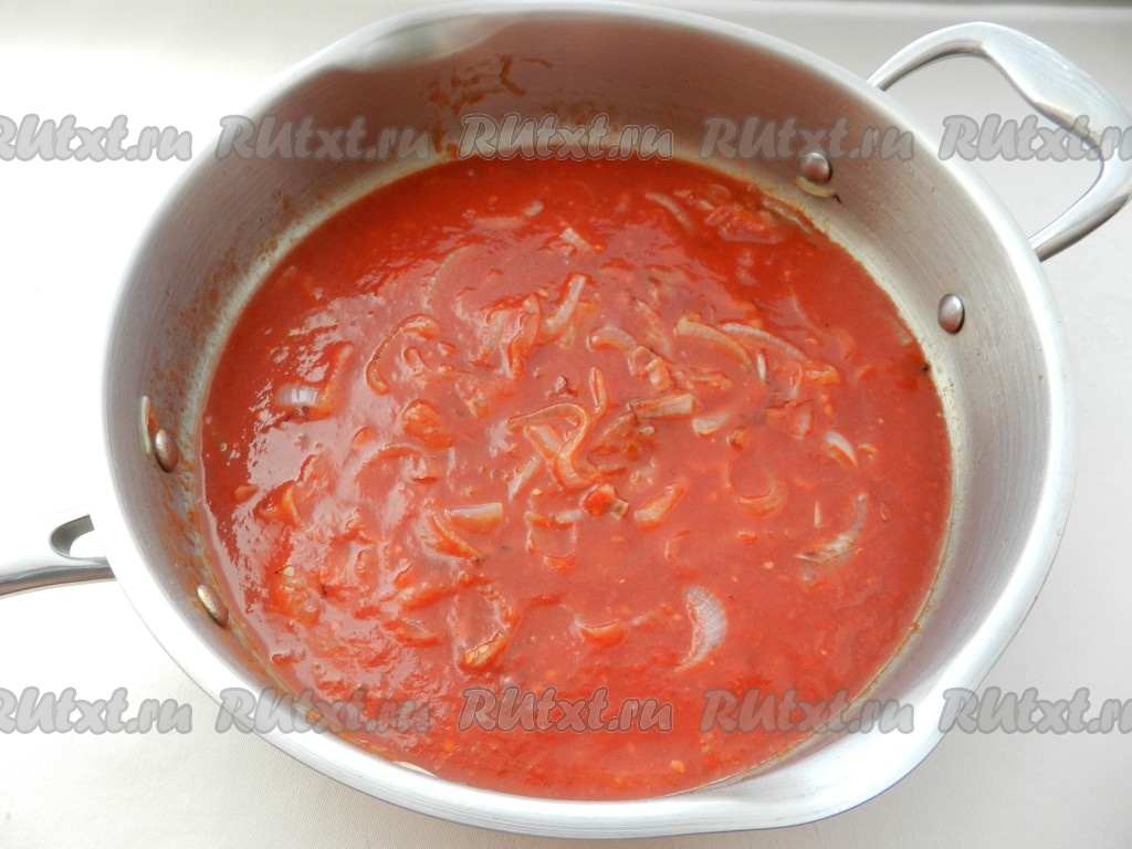 Влить томатный соус и прогреть. Домашний томатный соус можно заменить покупным томатным соусом или томатной пастой, разведенной с водой в соотношении 1:1.