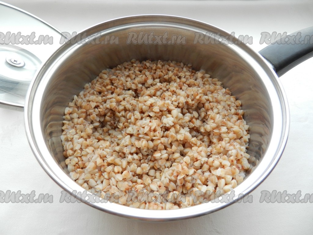 Гречневую крупу перебрать, вымыть. Всыпать в кипящую подсоленную воду и отварить до готовности. Остудить.