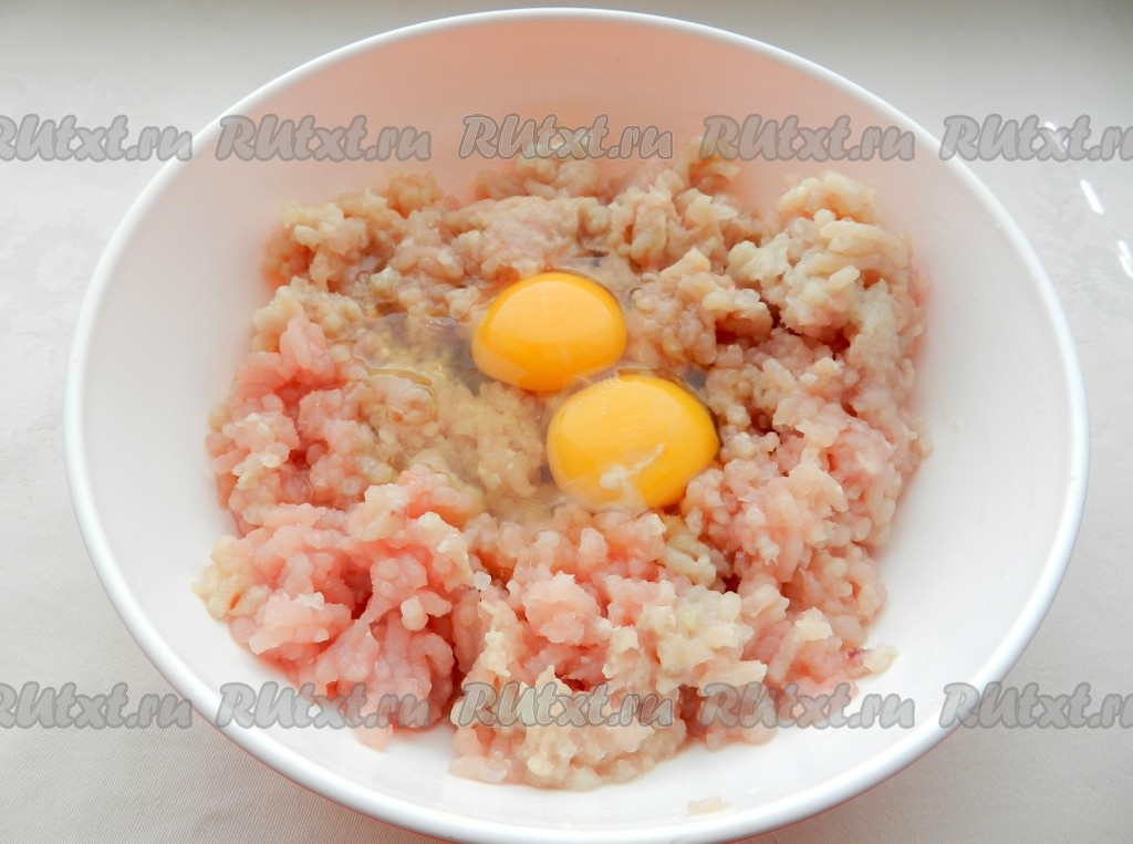 Добавить в фарш яйца, соль и перец по вкусу, тщательно вымесить.