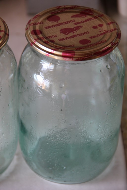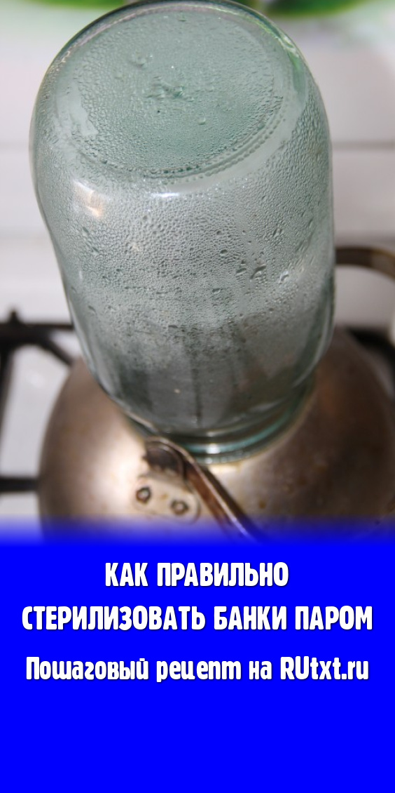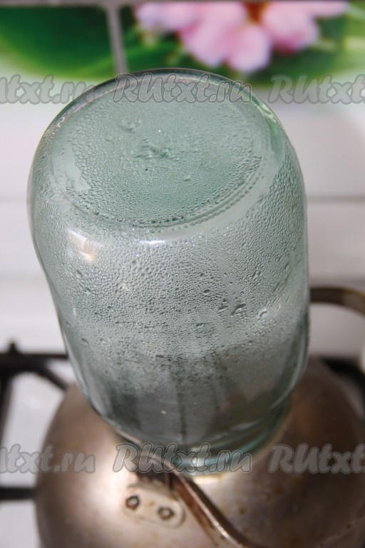 Итак, начинаем. Для стерилизации на пару достаточно взять чайник и довести до кипения в нем воду. Снять крышку с чайника и на её место поместить перевернутую банку. Стерилизовать минут 10, пока пар не осядет на банку и не начнёт стекать каплями.