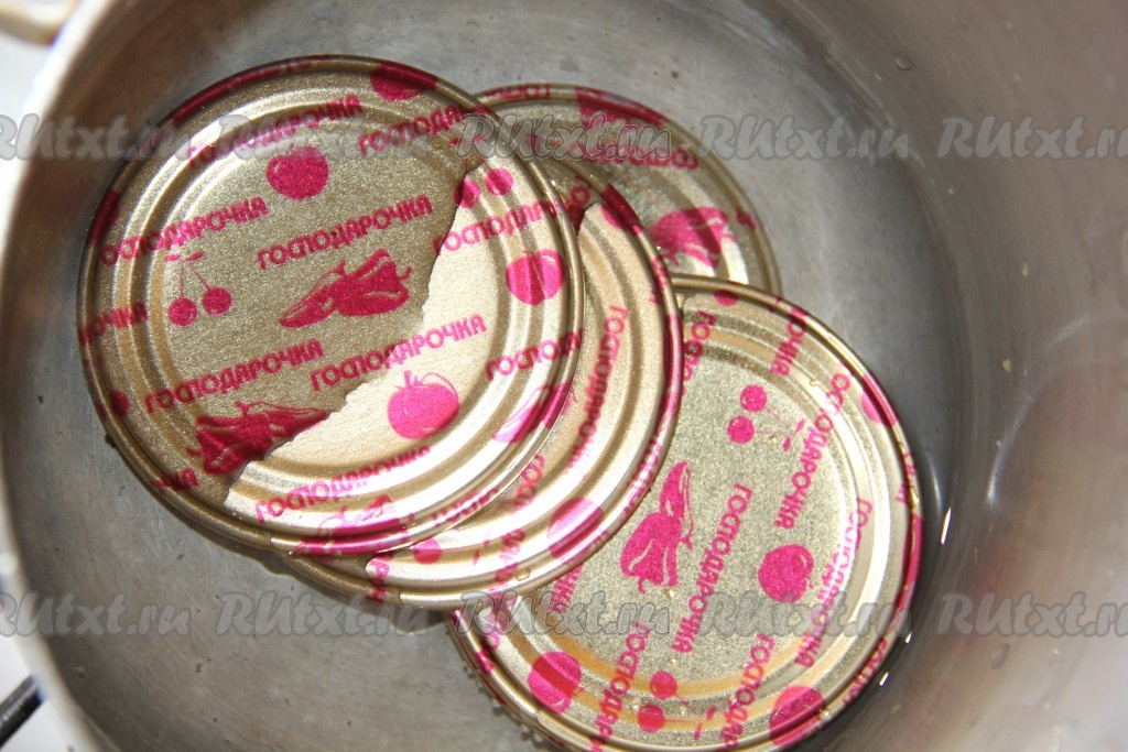 Крышки для банок кипятим в отдельной кастрюле минут 5 с момента закипания.