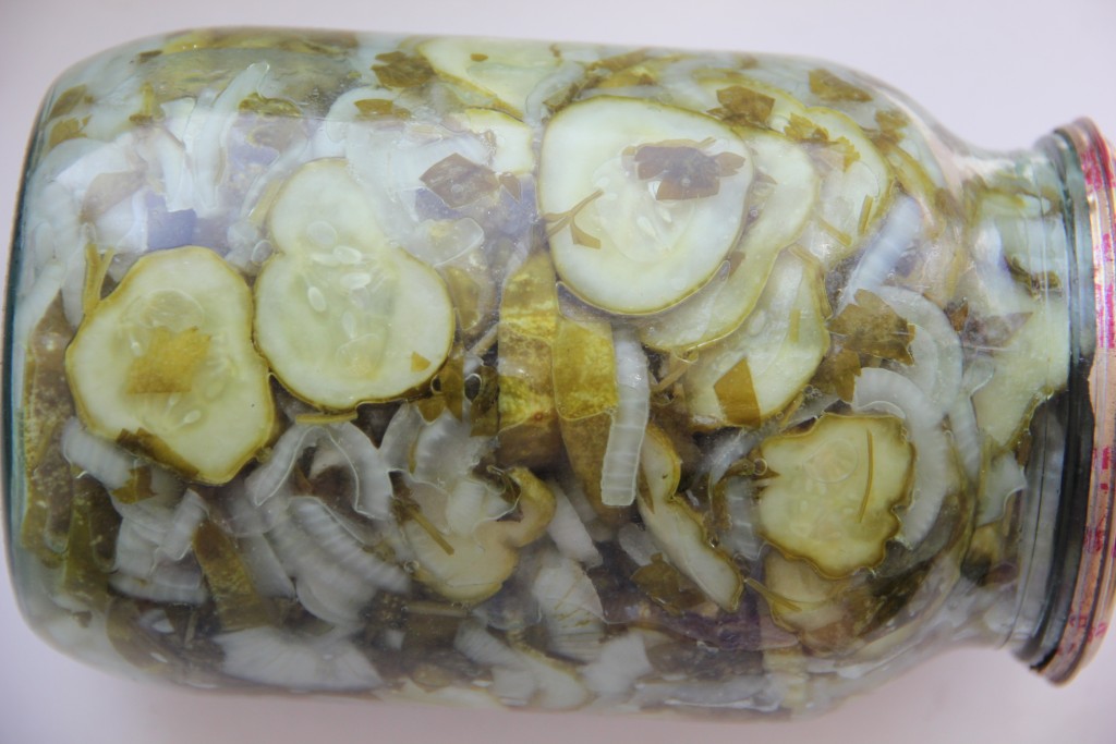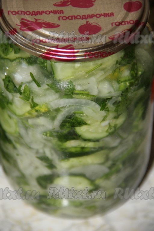 Очень вкусный салат "Нежинский", который придется как нельзя кстати в зимний холодный день. Из данного количества ингредиентов выходит 2 литра салата. Воды для рассола вам не потребуется, так как огурцы и лук пустят достаточно сока, который покроет наши овощи в банках.