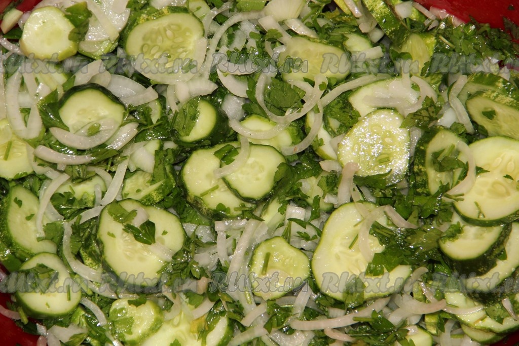 Огурцы нарезаем кружочками, лук - полукольцами, измельчаем петрушку, как можно мельче. Все смешиваем в большой миске, заливаем все уксусом, растительным маслом, добавляем соль и сахар. Все хорошенько перемешиваем и оставляем на пару часов напитаться и пустить сок.