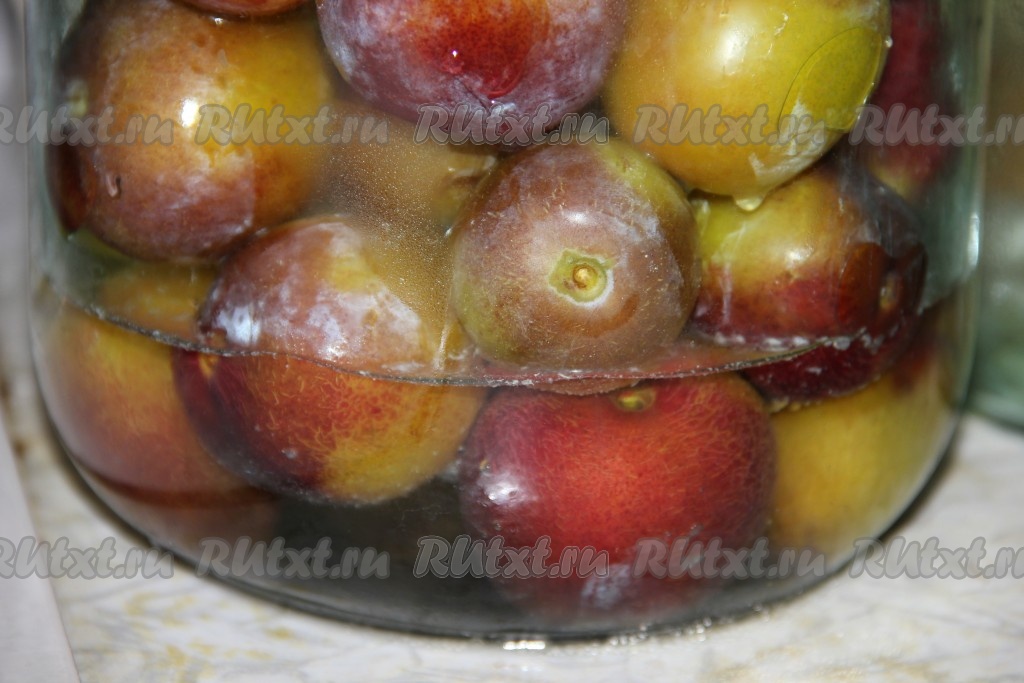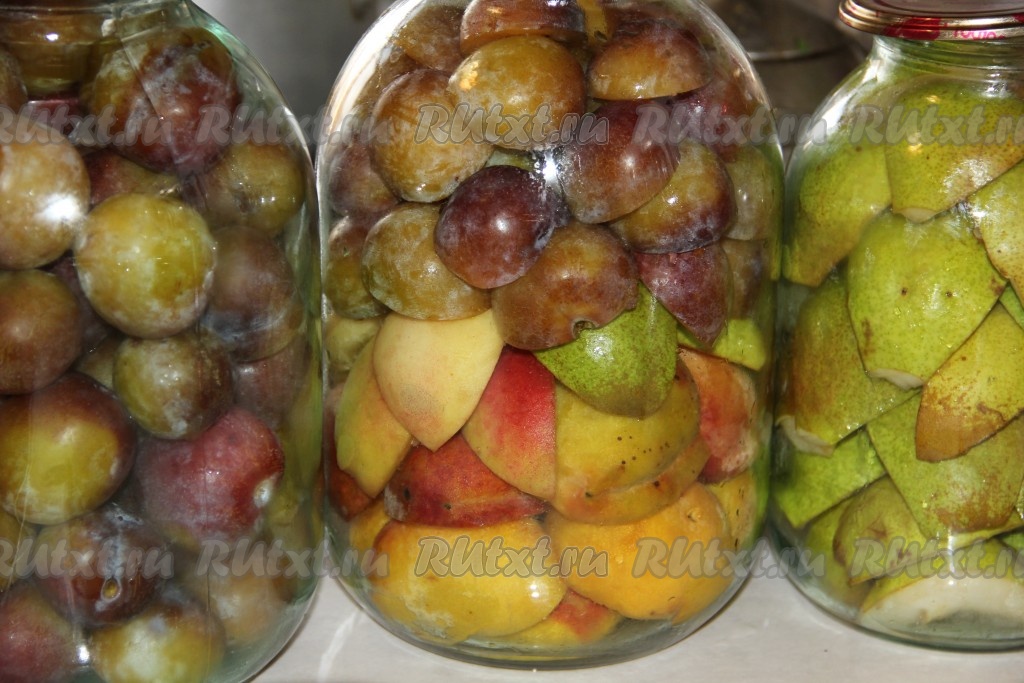 В стерильные банки уложить груши срезом вниз. В этом году я ради эксперимента закрутила таким образом сливы и персики.