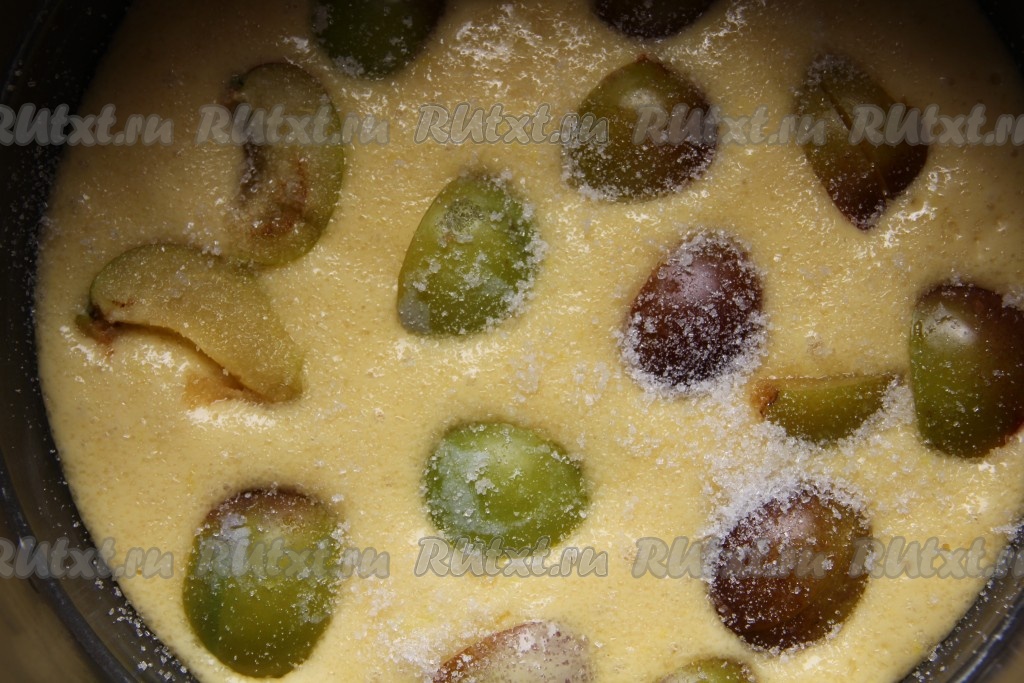 Готовое тесто для пирога вылить в форму для запекания, сверху выложить очищенные и нарезанные на дольки сливы, присыпать все обильно сахаром.