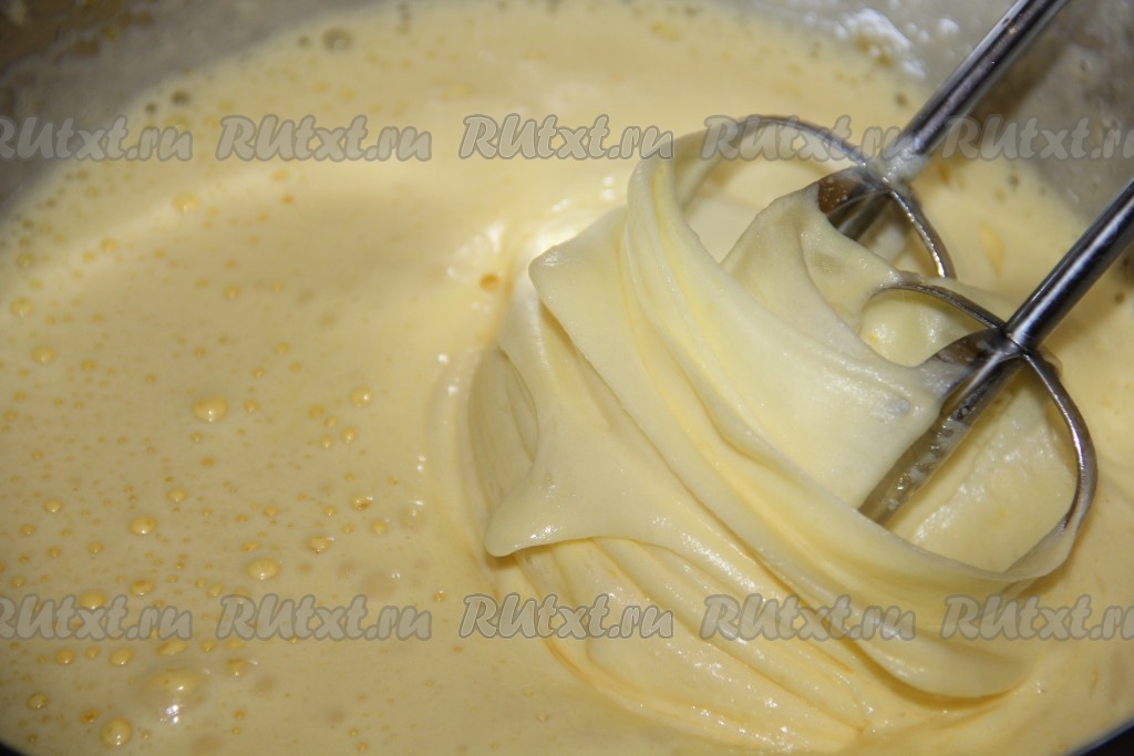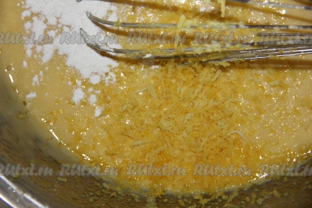 К тесту добавить разрыхлитель и цедру лимона. Тесто по консистенции будет напоминать густую сметану.