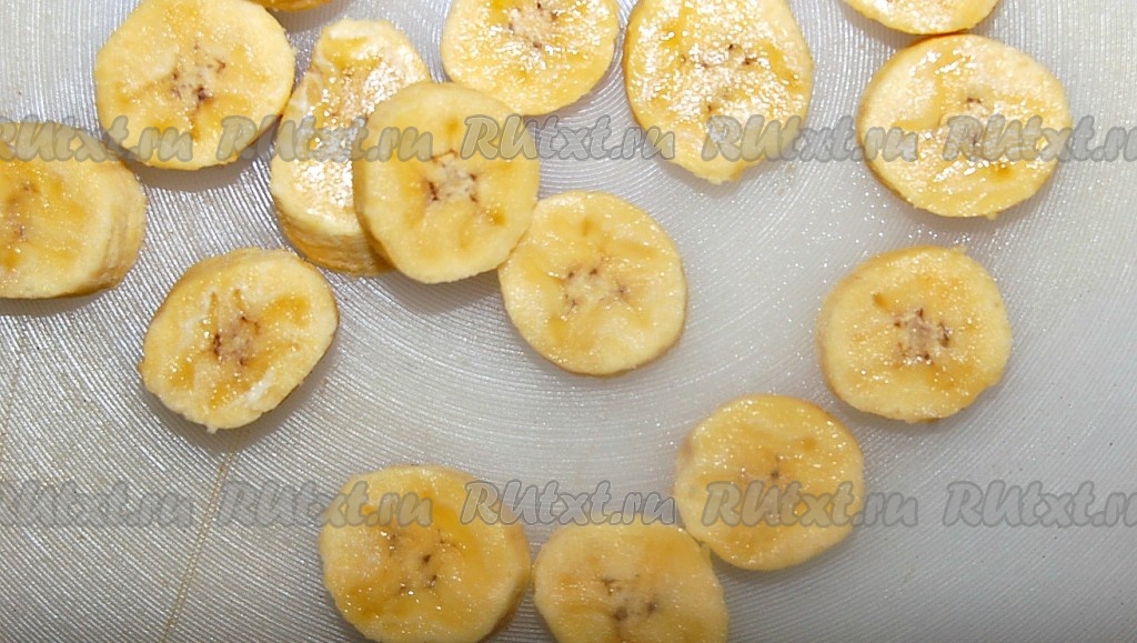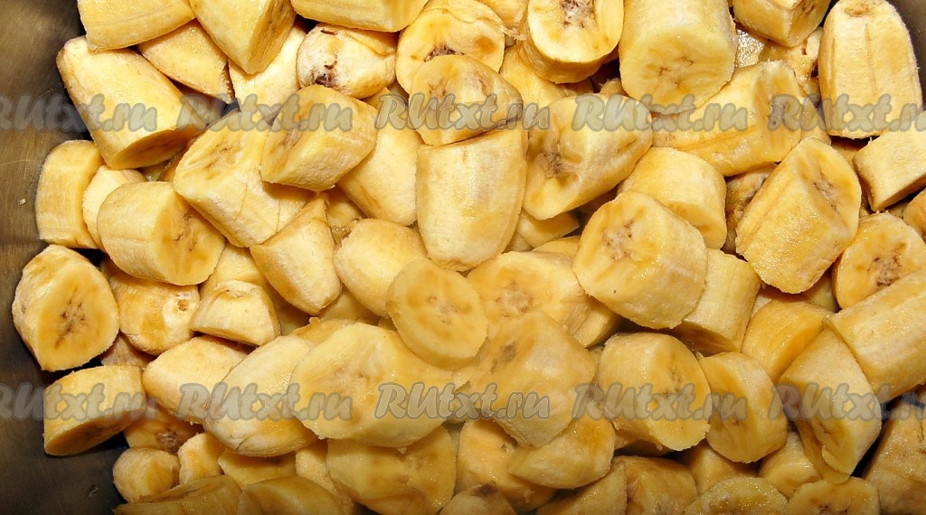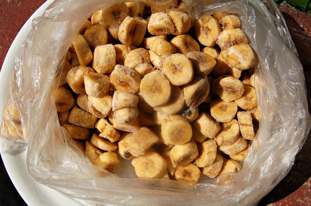 Взять полиэтиленовый пакет и вовнутрь разложить в один слой нарезанные бананы, стараясь, чтобы они не соприкасались между собой. Иначе они могут склеиться и качество их пострадает. Затем аккуратно разложить пакеты с бананами на доске, если пакетов несколько, их можно разместить друг на друге. Затем отправить в морозилку.