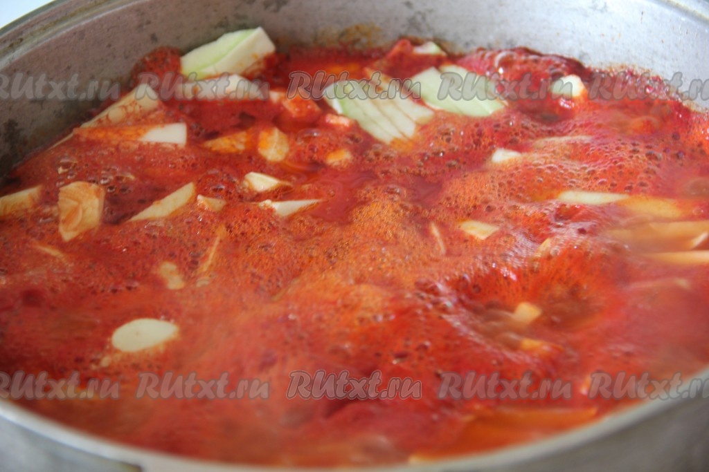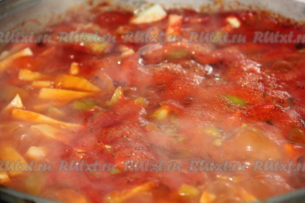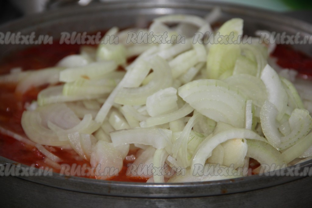 Лук нарезаем полукольцами, как на фото, и отправляем к нашим овощам. Варим 15-20 минут.