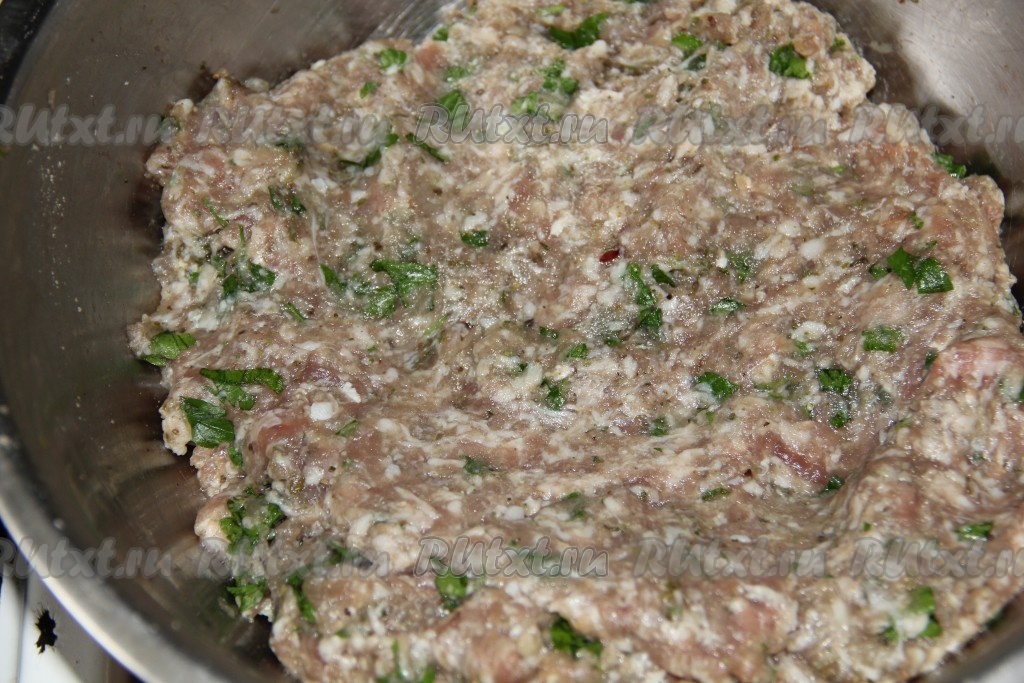 К мясному фаршу добавляем лук перемолотый на мясорубке, мелко рубленную зелень, выдавленный чеснок, соль и армянскую приправу. Хорошенько мясо отбиваем и даем настояться.