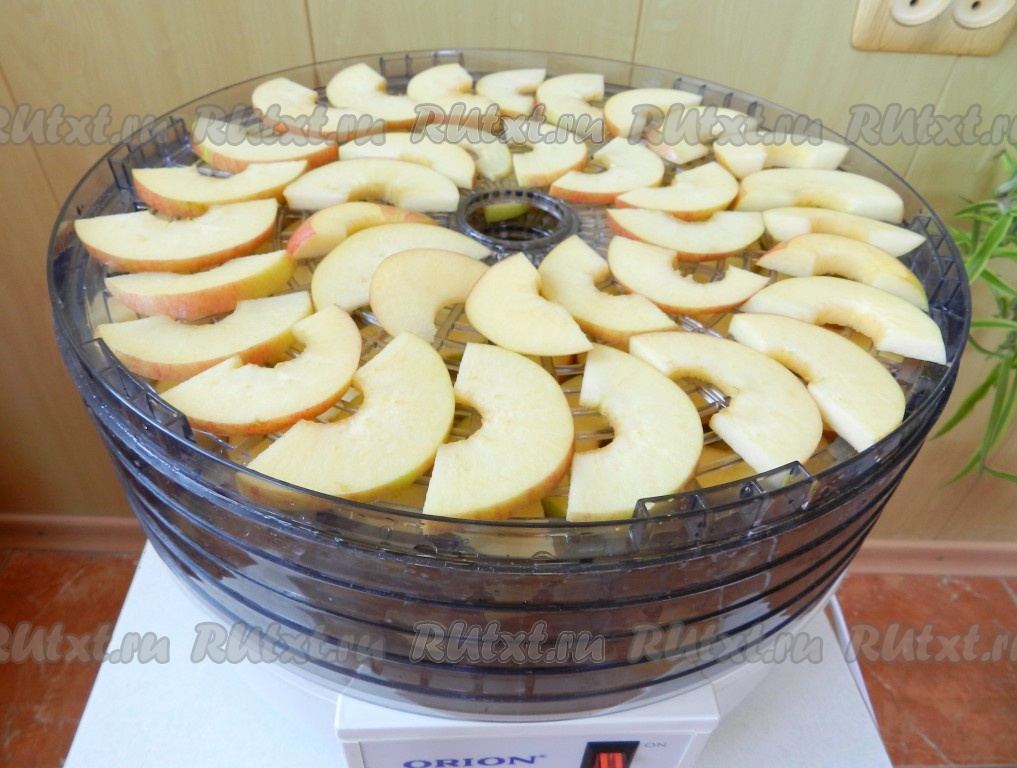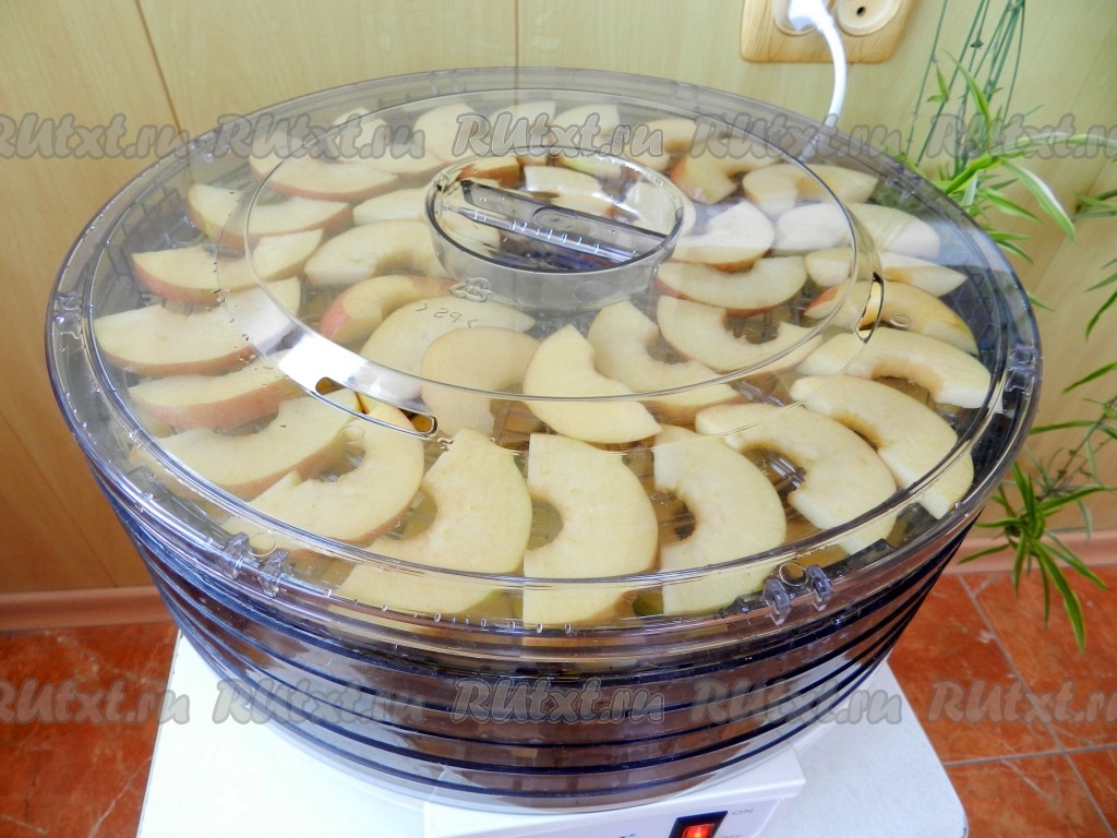 Закрыть крышку и включить электросушилку. Время сушки яблок зависит от их сочности и толщины нарезки. В любом случае это не менее шести часов.