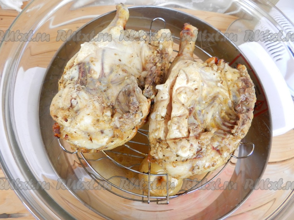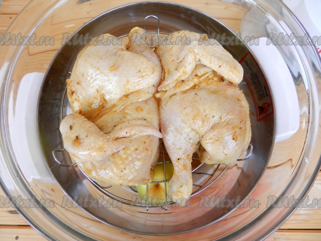 Вкусную и румяную курочку, приготовленную в аэрогриле, подавать вместе с запеченными яблоками.