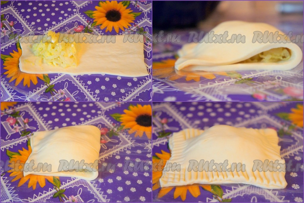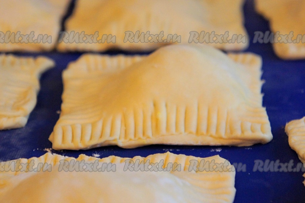 Тесто разморозить. На рабочую поверхность (при необходимости) добавить муку. Выложить тесто, разрезать на небольшие прямоугольники (размер прямоугольников зависит от желаемого размера пирожков). На один край выложить капустную начинку, свернуть "конвертик" пополам и обработать края вилкой, плотно прижимая её к слоеному тесту. Таким образом сформовать все остальные пирожки-конвертики.