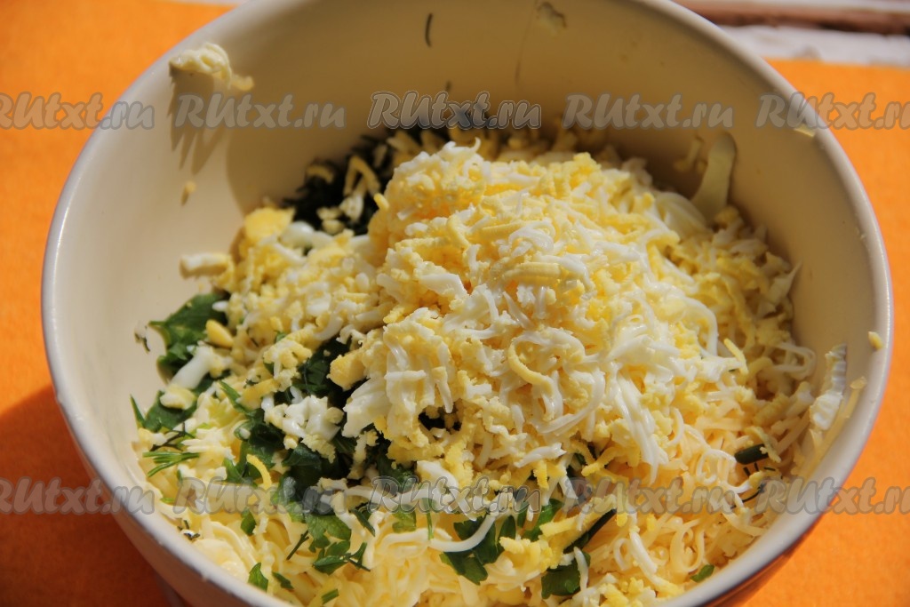 Для приготовления начинки для котлет "Птичье молоко" прежде всего нужно отварить яйца в течение 10 минут с момента закипания воды, затем остудить их, очистить, натереть на крупной тёрке в глубокую миску. Сюда же добавить сливочное масло, натёртое на крупной тёрке. Зелень (у меня - укроп и петрушка) вымыть, обсушить, мелко нарезать. Сыр натереть на крупной тёрке. Зелень и сыр добавить в миску с яйцами и маслом, перемешать и начинка для куриных котлет "Птичье молоко" готова.