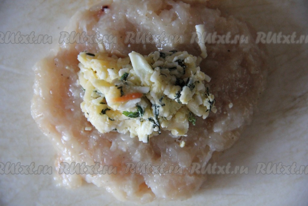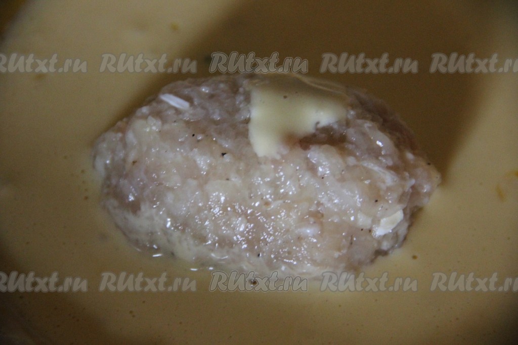 Влажными руками взять часть фарша, размять в лепёшку, в середину выложить немного начинки, защипнуть края мясной лепёшки над начинкой (вся начинка должна оказаться внутри), формируя котлету.