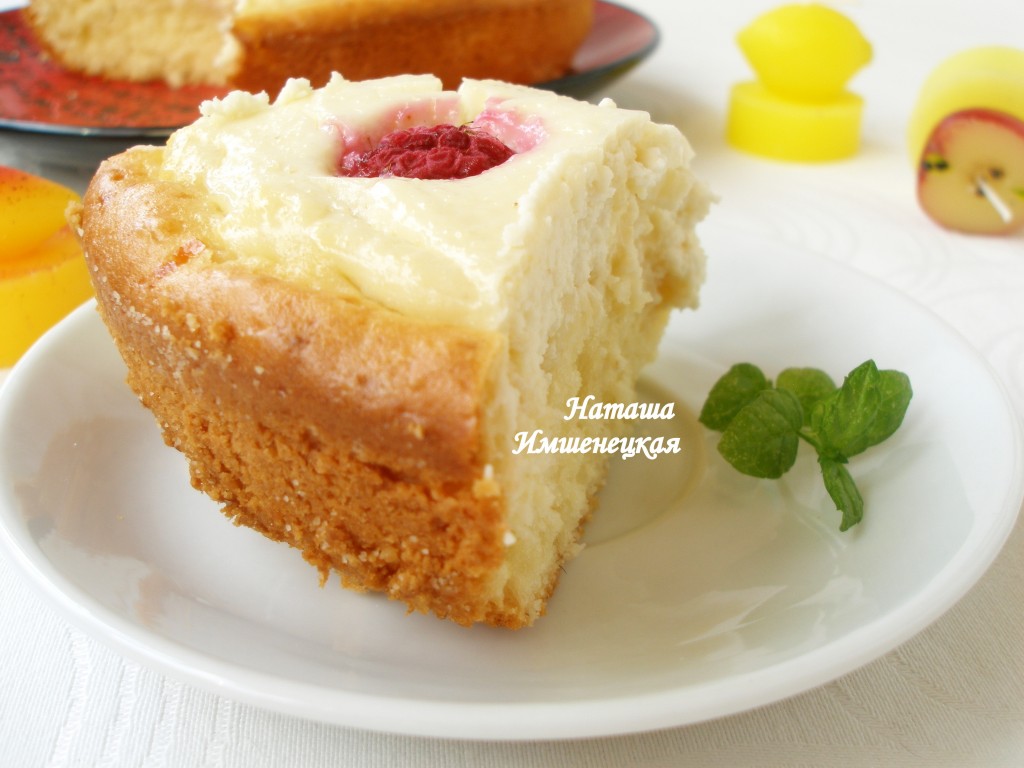 На начинку разложить ягоды, немного вдавить. Я специально использовала малину в замороженном виде, так как она и после выпечки сохраняет свою форму. Поставить в холодную (!) духовку, выставить температуру 180 градусов и выпекать быструю ватрушку 35-45 минут.