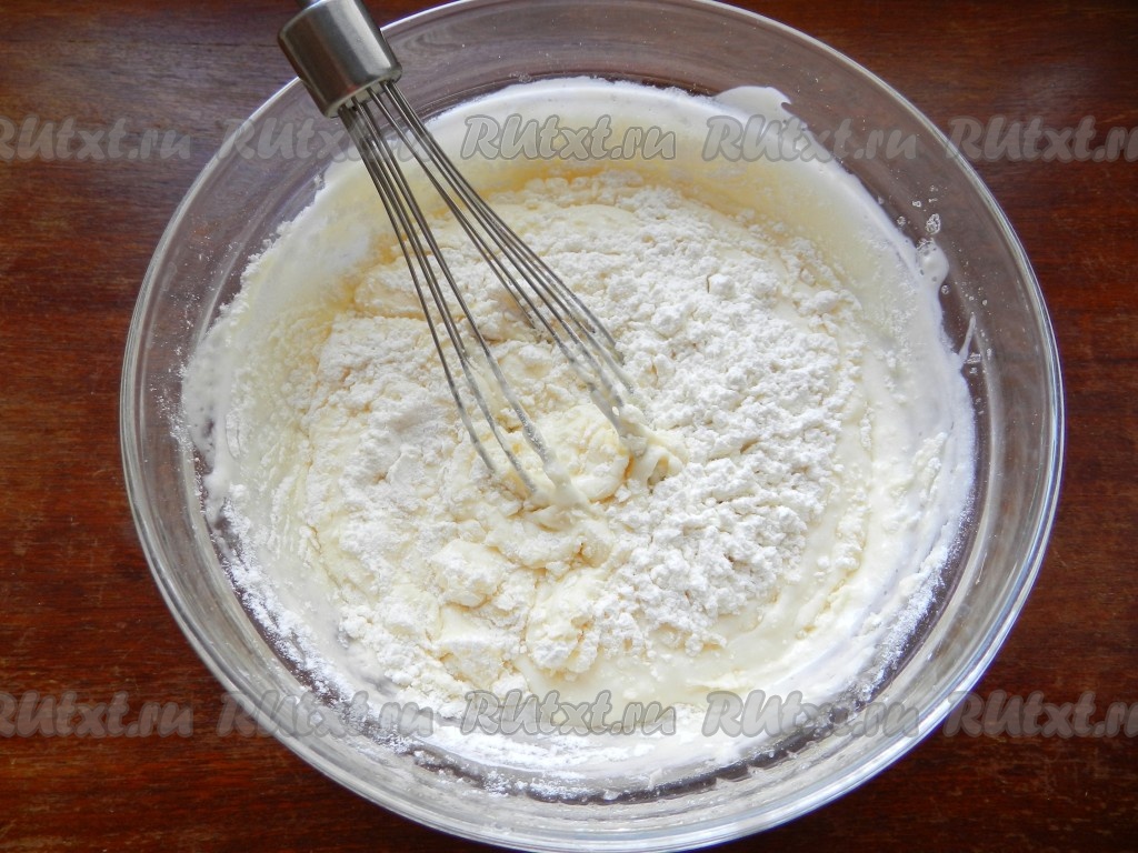 Постепенно всыпать муку с разрыхлителем. Взбить до однородности. Должно получиться густое вязкое тесто.