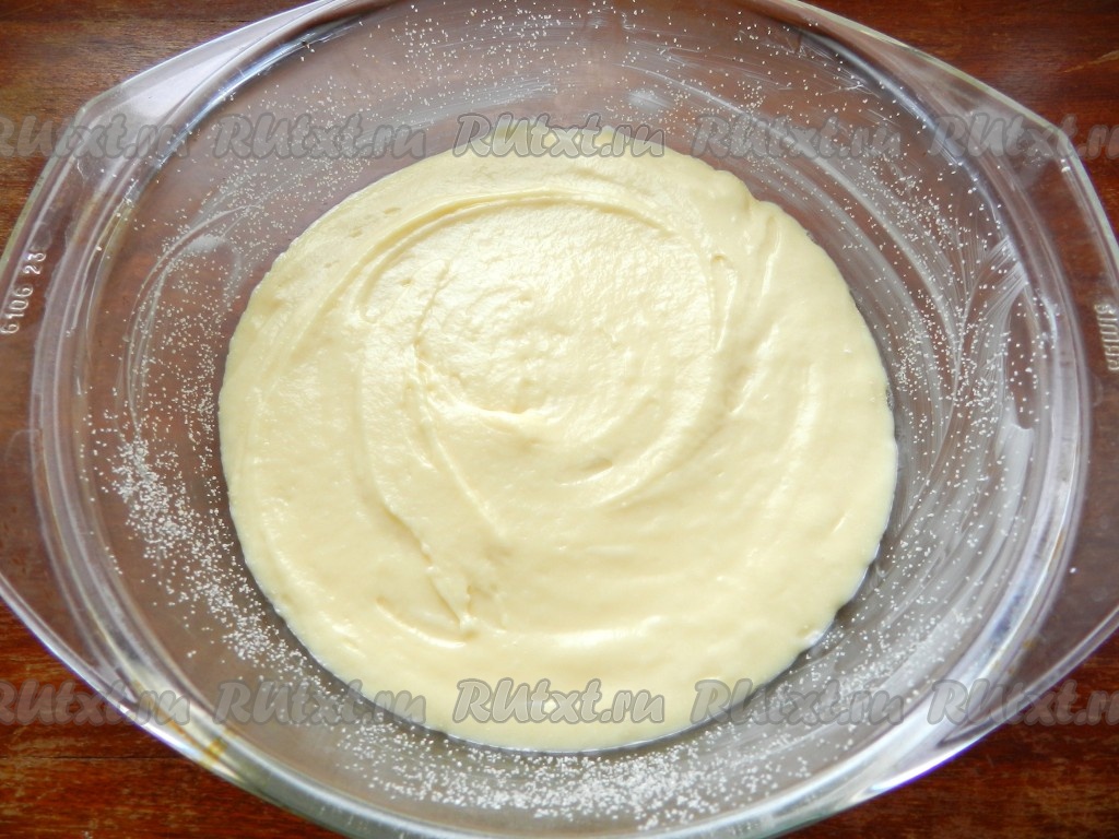 Форму для выпечки диаметром 18 сантиметров смазать маслом, присыпать манной крупой (или мукой). Если вы готовите в силиконовой или антипригарной форме, можно этого не делать. В форму выложить тесто, разровнять.