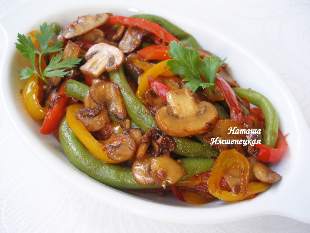 Очень вкусную, аппетитную стручковую фасоль вместе с шампиньонами и болгарским перцем посыпать свежей зеленью и подать к столу.