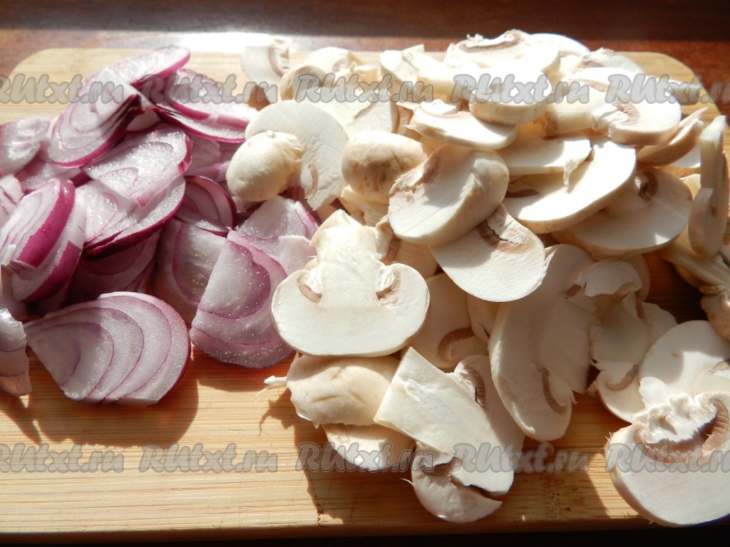 Нарезать лук на тонкие полукольца. Шампиньоны нарезать на пластины.