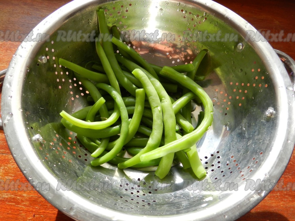 Стручковую фасоль опустить в кипящую подсоленную воду и варить с момента закипания на небольшом огне 7 минут (фасоль должна стать достаточно мягкой, но при этом развариться она не должна). Затем воду слить, фасоль обдать холодной водой.