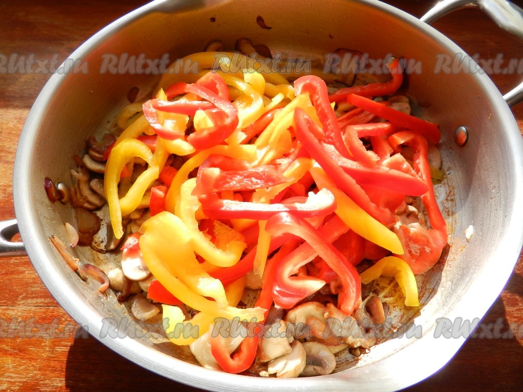К грибам, обжаренным с луком, выложить болгарский перец, нарезанный на полоски, посолить, добавить специи и пропущенный через пресс чеснок, перемешать и готовить овощи с шампиньонами 5 минут, время от времени помешивая.
