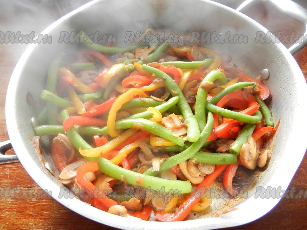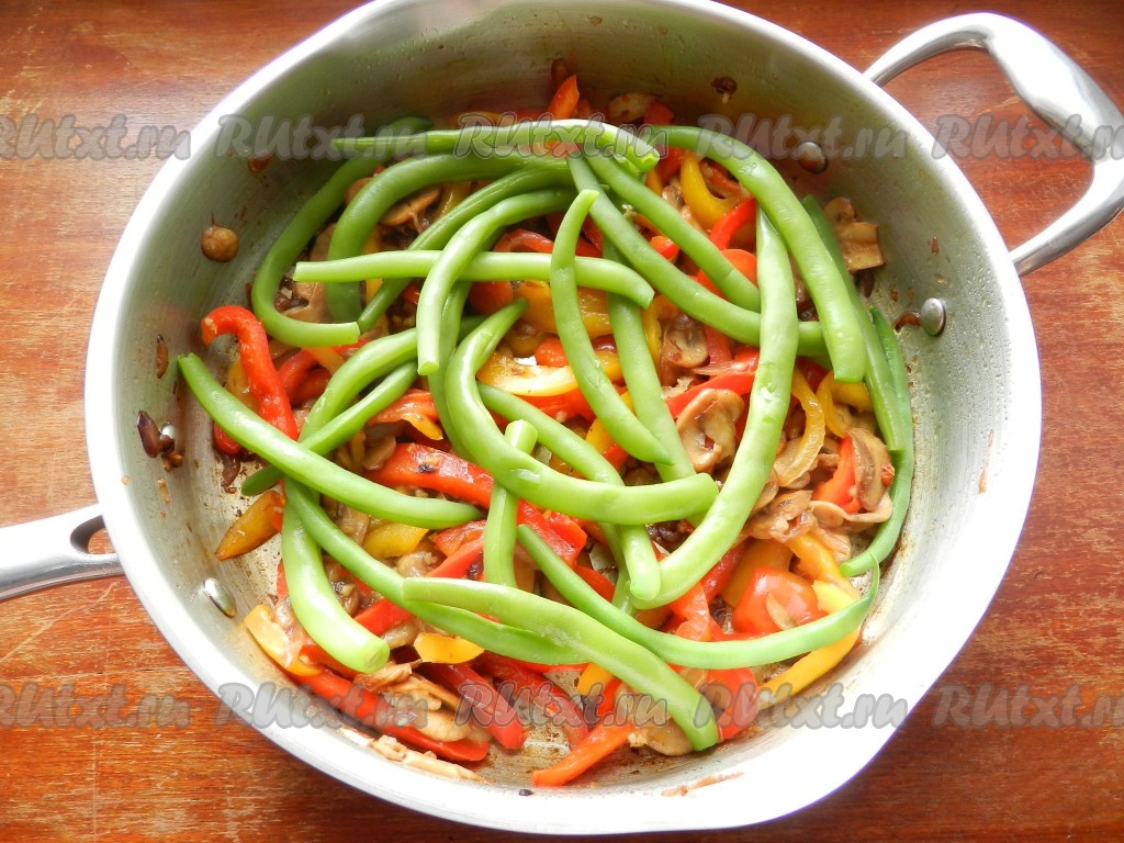 Болгарский перец лучше взять разных цветов, тогда блюдо получится более ярким. Удалить семечки и плодоножки из перца. Шампиньоны промыть водой, убирая с грибочков все загрязнения, дать немного обсохнуть. Лук и чеснок очистить. Стручковую фасоль промыть водой, отрезать "кончики" с двух сторон.