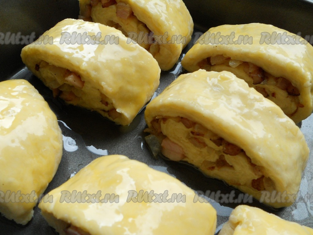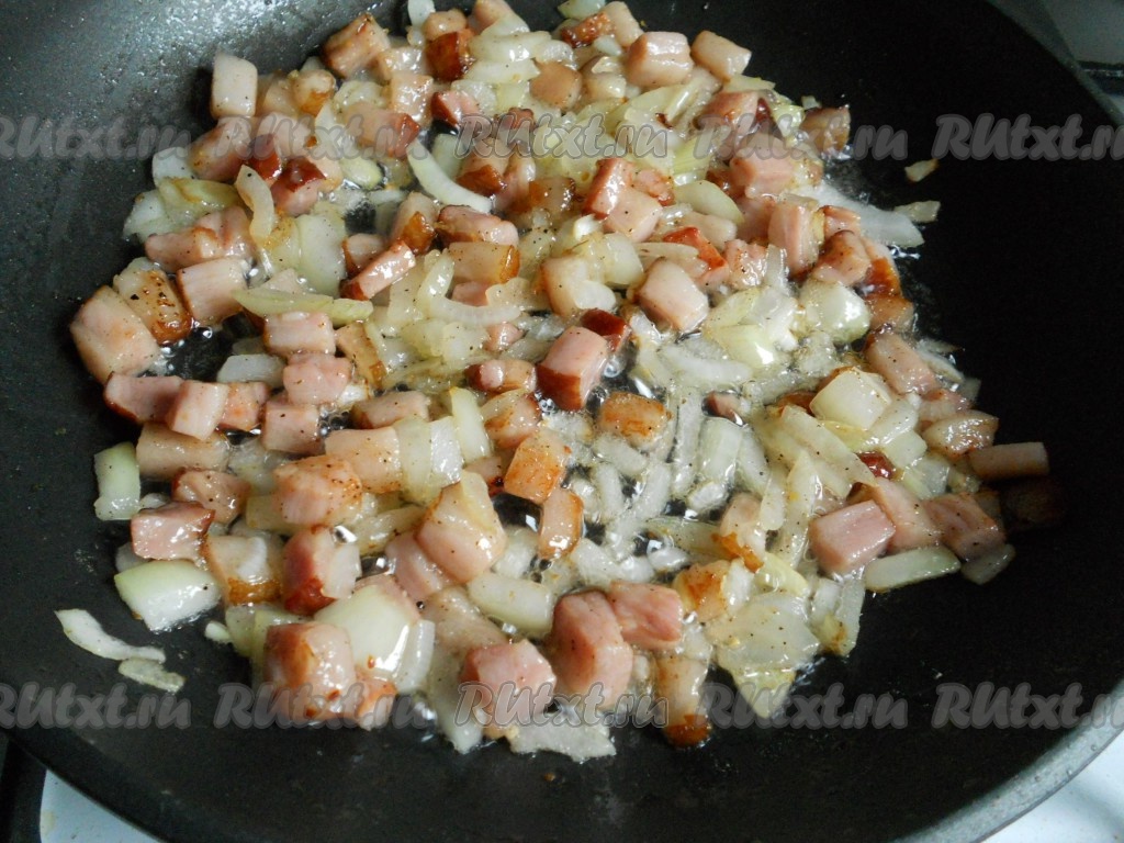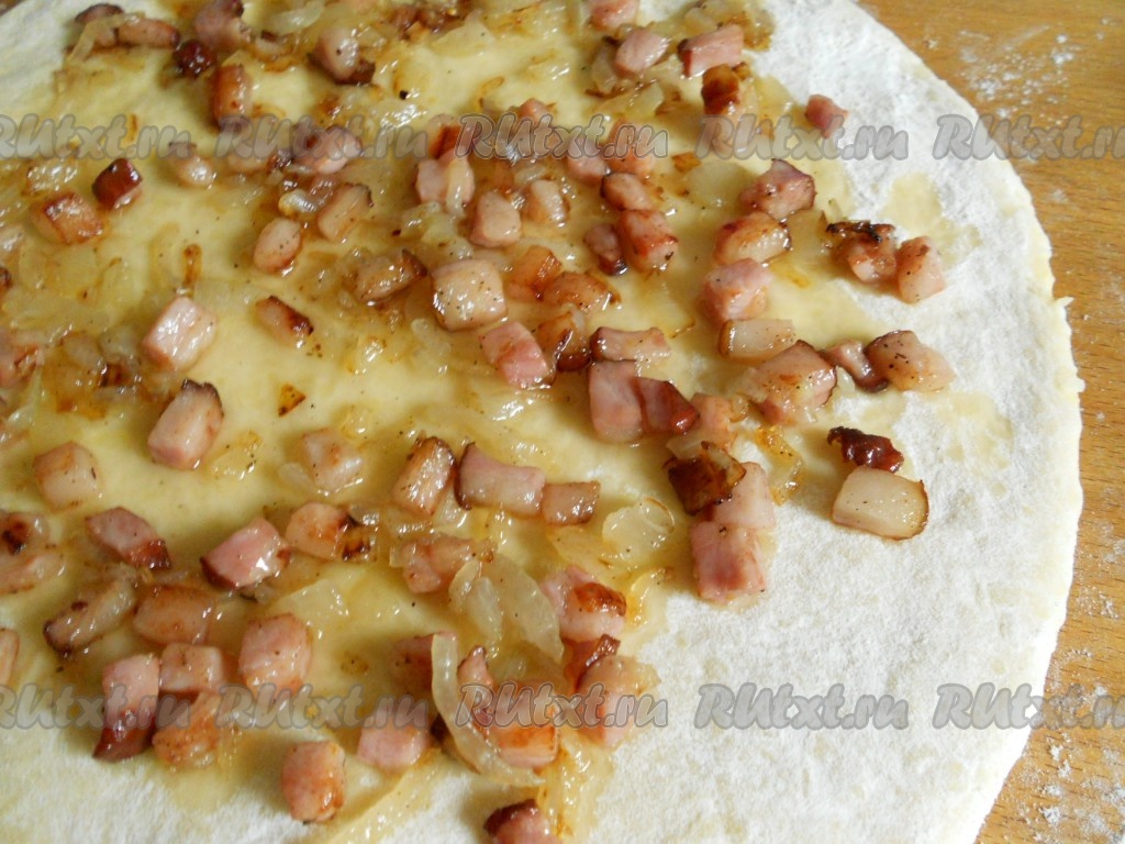 Тесто накрыть полотенцем и дать ему "отдохнуть" минут 30. В это время приготовить начинку: на сковороде обжарить измельченный лук, добавить к нему порезанный кусочками бекон. Посолить и поперчить.