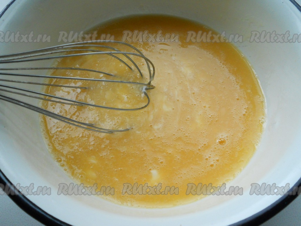 Яйца размешать венчиком с солью, добавить сметану, растопленное и охлажденное сливочное масло.