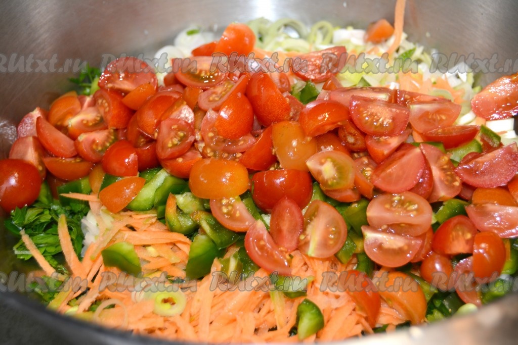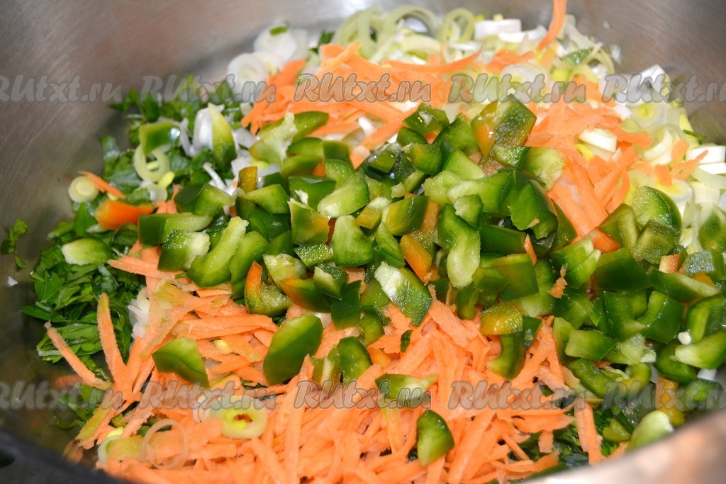 Перец сладкий мелко нарезать и добавить к овощной смеси.