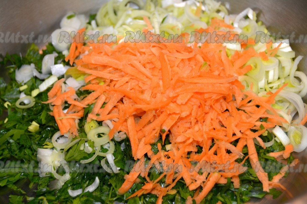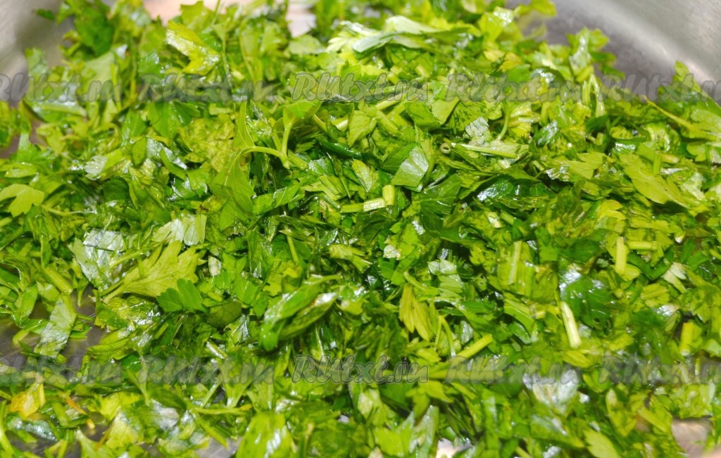 Все овощи нужно помыть и обтереть. В большую миску нарезать зелень (у меня петрушка).