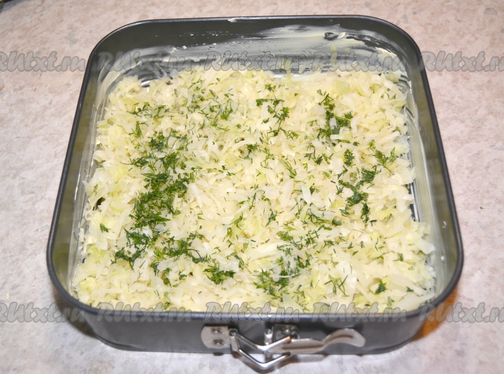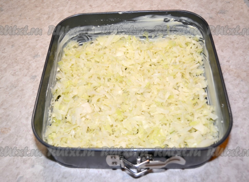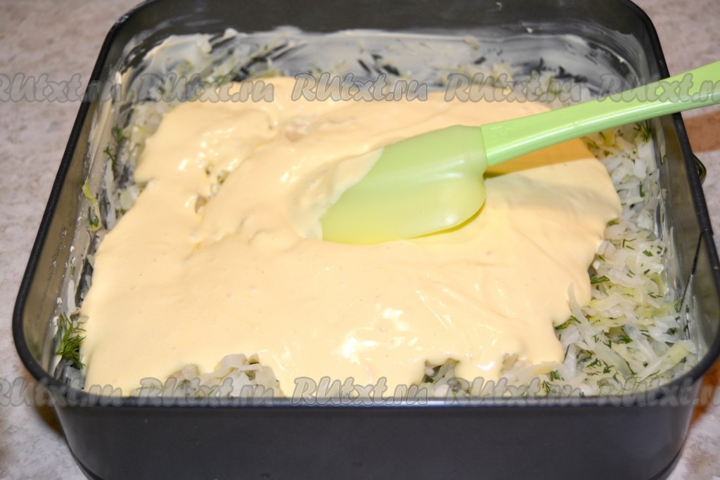 Залить равномерно капусту тестом. Распределить тесто по капусте с помощью силиконовой лопатки (или столовой ложки).