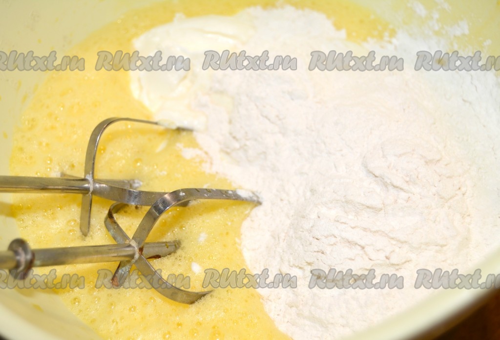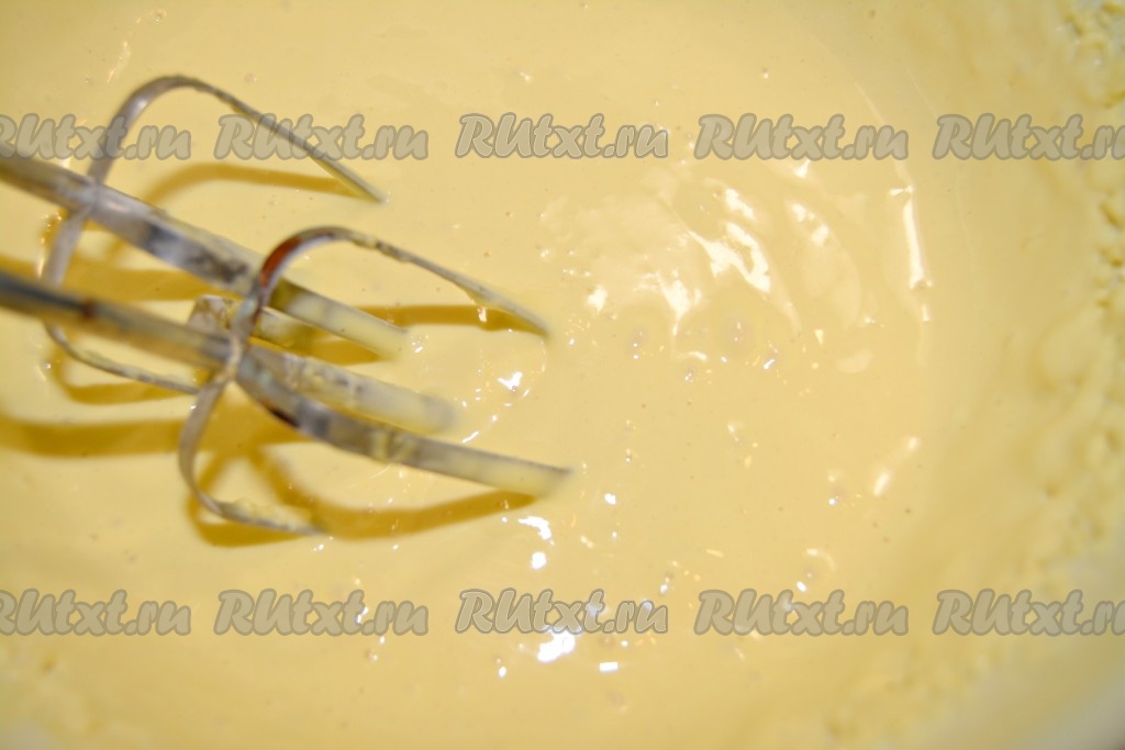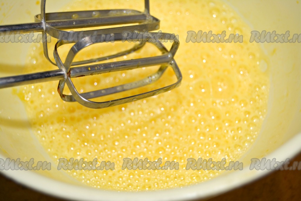 Для замешивания теста нужно в достаточно объёмной миске миксером (или венчиком) взбить яйца в течение 2-3 минут.