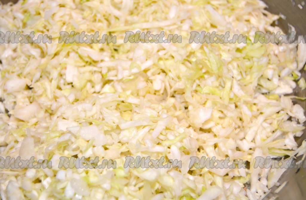 Посолить капусту и помять руками. Если капуста молодая, её можно и не мять руками, она и так достаточно сочная. Если капуста зимних сортов, её нужно хорошо помять руками, чтобы она стала более сочной.