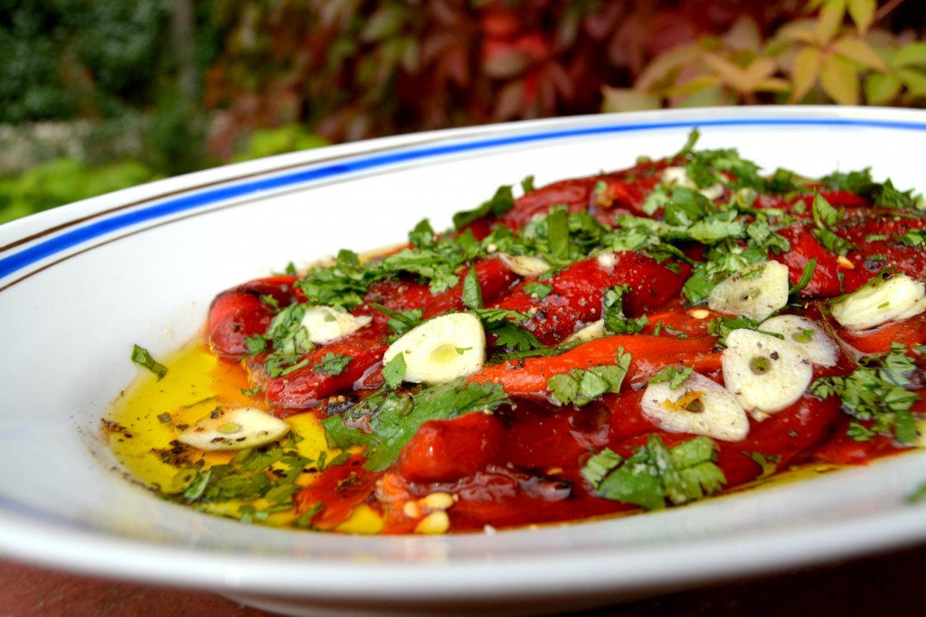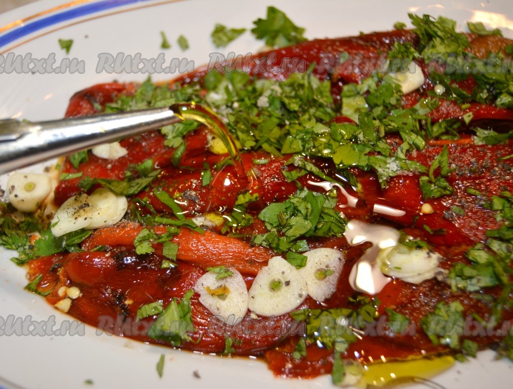 Выложенные перцы посолить, поперчить, полить лимонным соком, оливковым маслом, посыпать тонко нарезанным чесноком и порезанной зеленью.