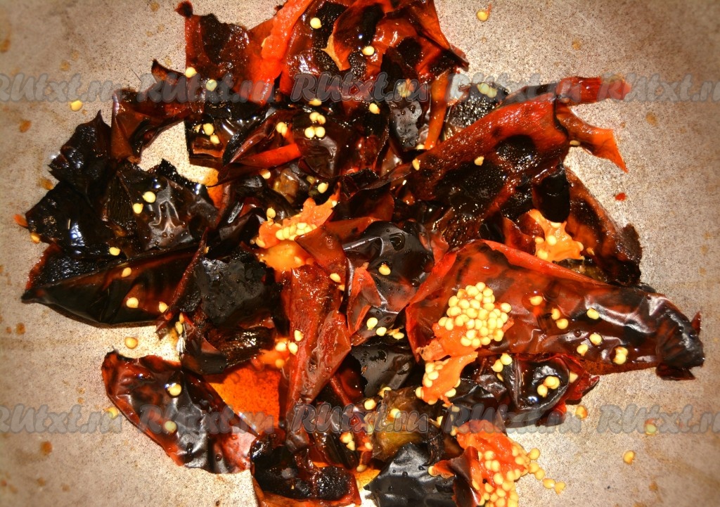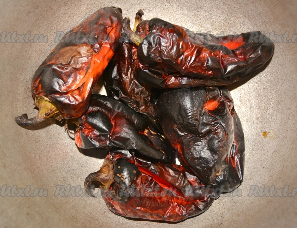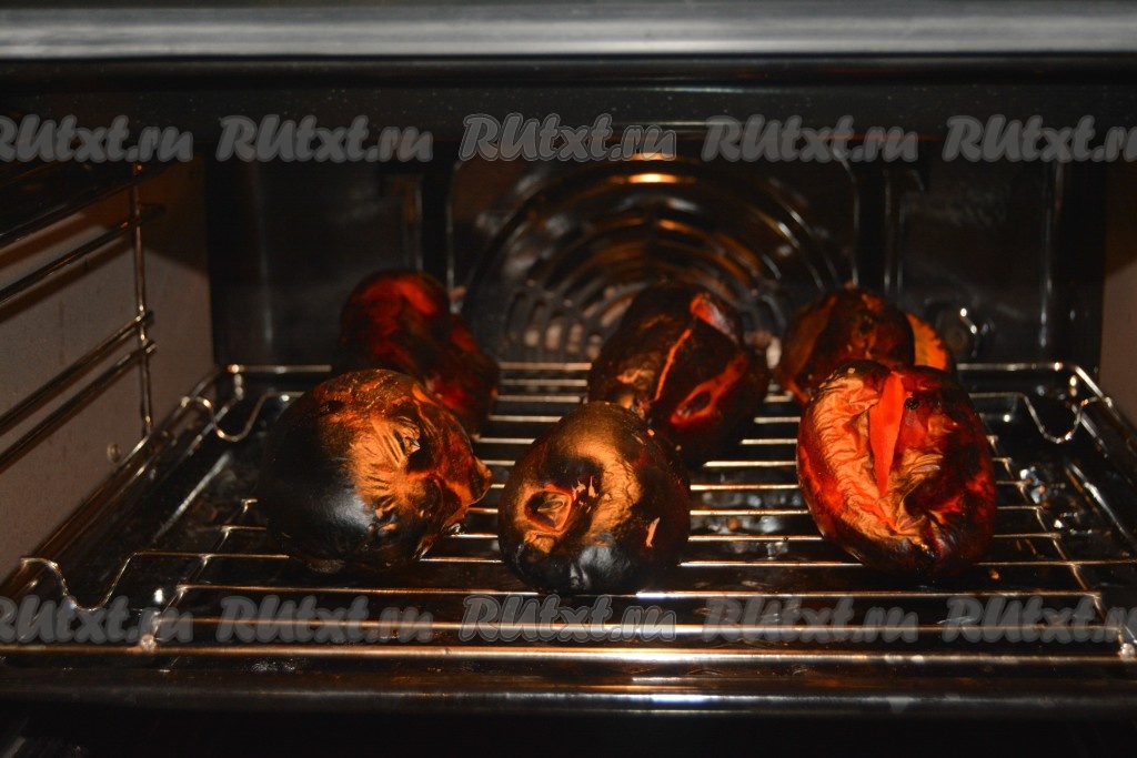 Примерно через 45 минут кожица перца потемнеет и почернеет, тогда можно вытащить его из духовки.