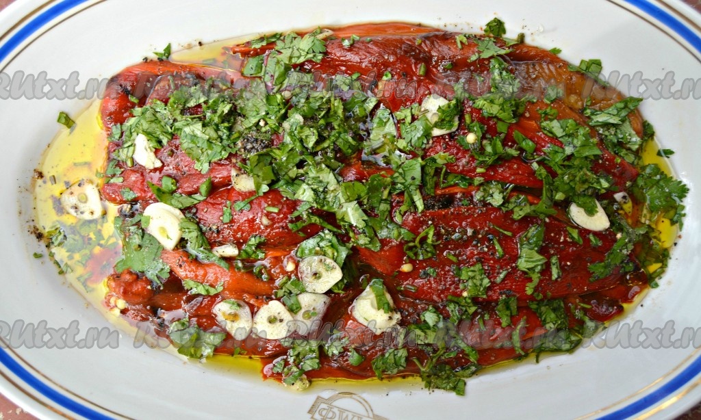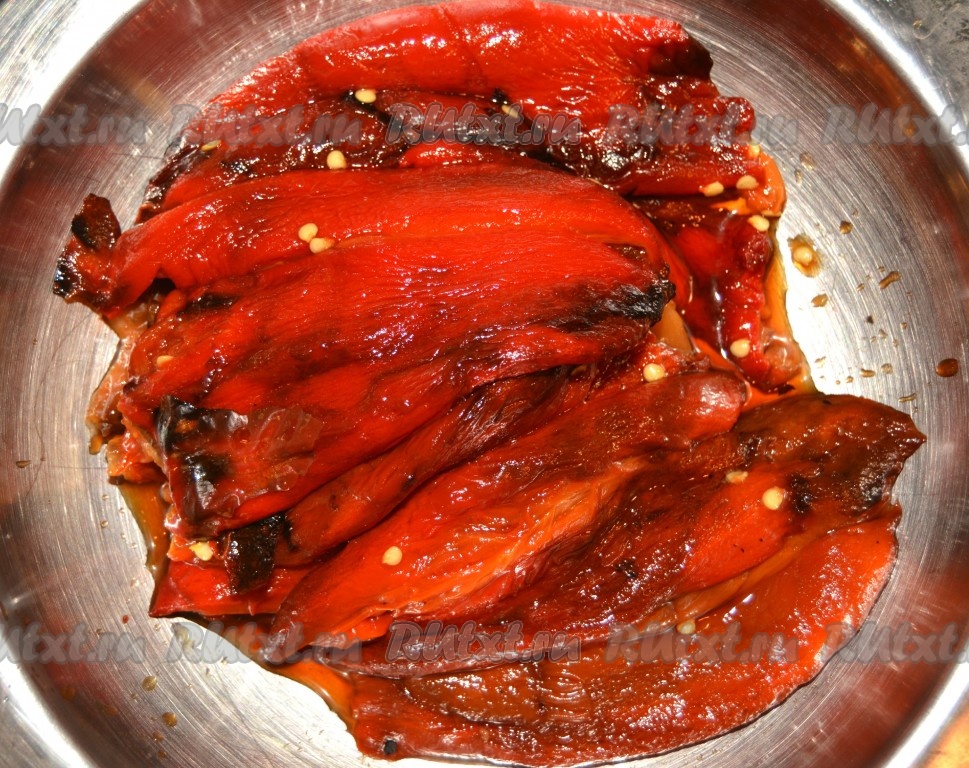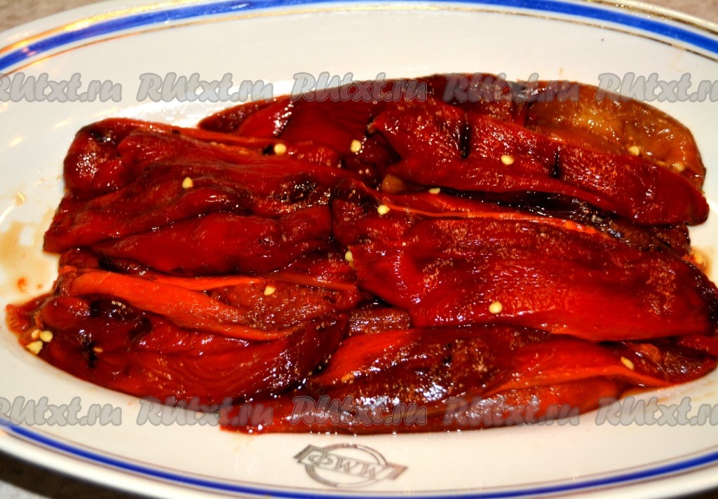 Накрыть блюдо с перцами пищевой пленкой и убрать в холодное место от 1 до нескольких часов. За это время болгарский перец, запеченный в духовке, пропитается вкусной заправкой и будет готов к употреблению.