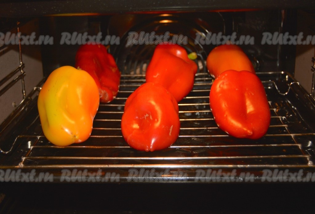Болгарский перец вымыть, тщательно высушить, сложить на решетку (противень) и отправить запекаться в заранее нагретую до 250 градусов духовку.