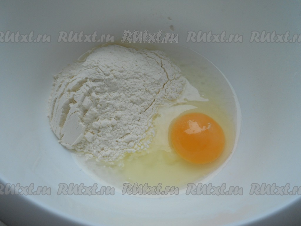 Приготовить тесто для лапши: к яйцу добавить 1 чайную ложку воды и просеянную муку.