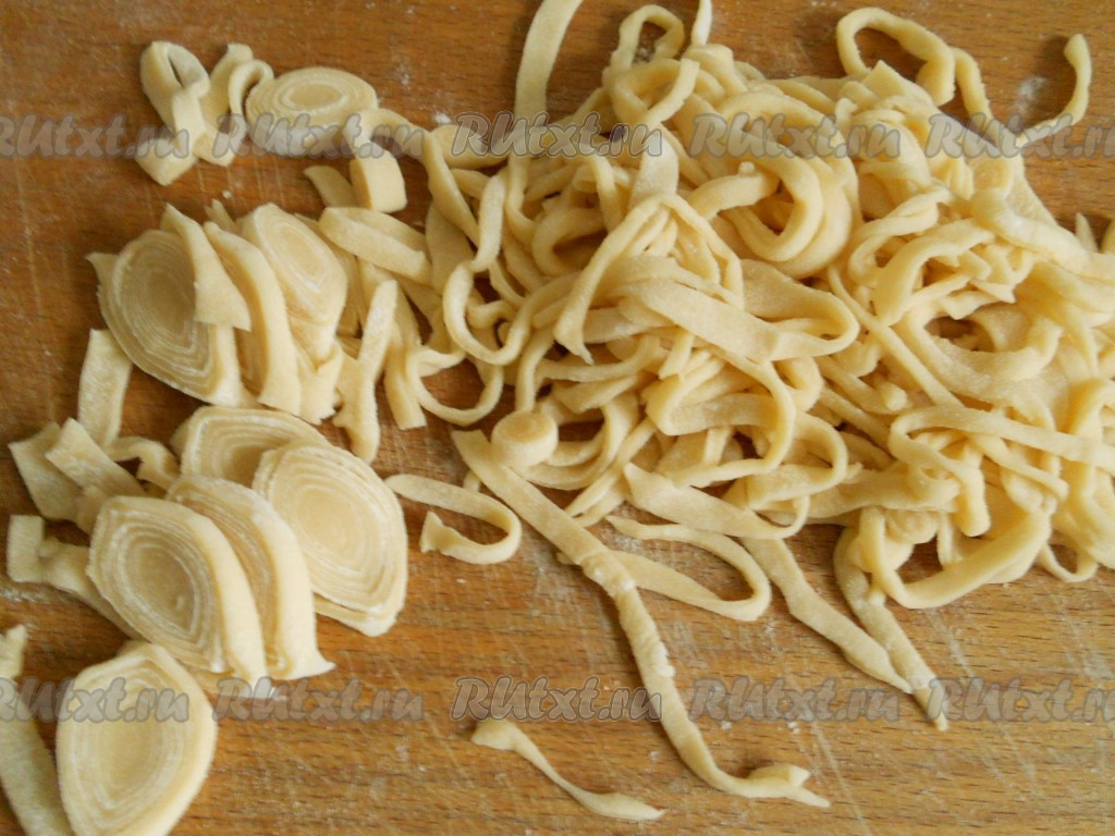 Далее острым ножом порезать тонкими полосками. Руками перемешать лапшу, чтобы она развернулась и разместить ее на бумаге, чтобы немного подсохла.