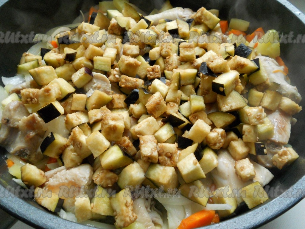 Перемешать и обжаривать на небольшом огне все вместе 10 минут. Затем добавить порезанные небольшими кубиками баклажаны.