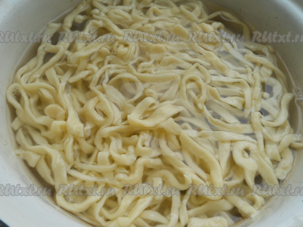 Отварить подготовленную лапшу в подсоленной воде 5-7 минут. Откинуть на дуршлаг, промыть горячей водой.