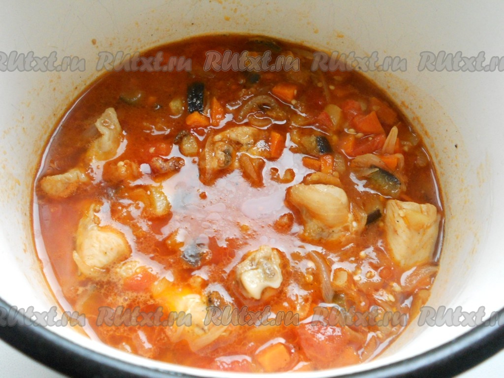 Перемешать, добавить немного воды, сахар, посолить, поперчить и тушить 5-7 минут. Переложить содержимое сотейника в кастрюлю. Влить воду или бульон так, чтобы жидкость покрывала овощи с мясом выше на 2 пальца.