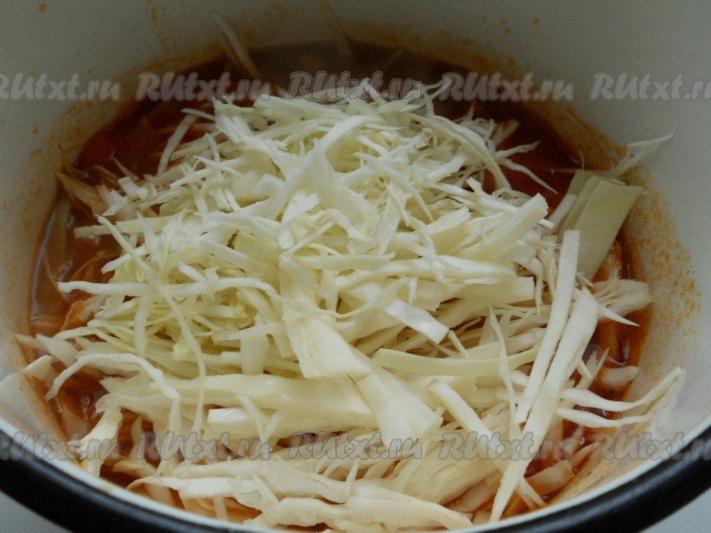 Поставить кастрюлю на огонь. Довести до кипения, тушить на небольшом огне 10-15 минут. Затем, добавить нашинкованную капусту. Перемешать, готовить еще 10 минут.