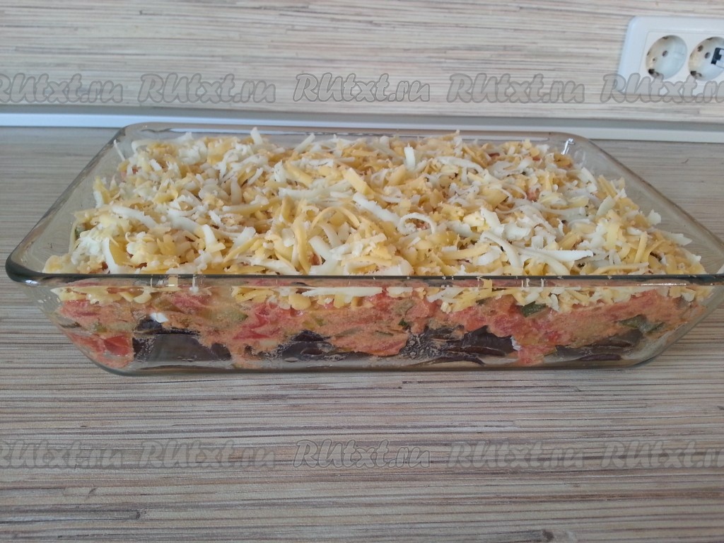 Сверху посыпать овощную запеканку из баклажанов, кабачков и помидоров тертым сыром и затем панировочными сухарями.