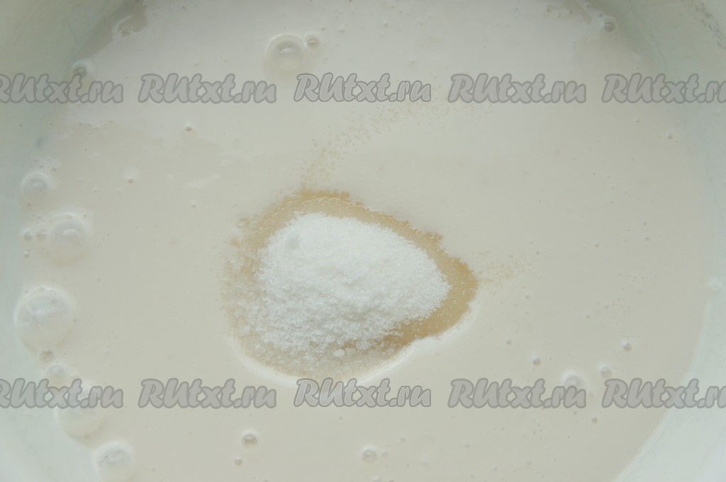 В достаточно (!) тёплый кефир добавьте сахар, соль, перемешайте.