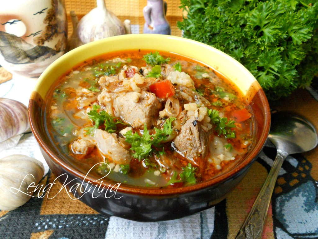 Разлить по тарелкам, обильно посыпать измельченной кинзой или петрушкой и наслаждаться замечательным грузинским ароматом и вкусом харчо из свинины с рисом!