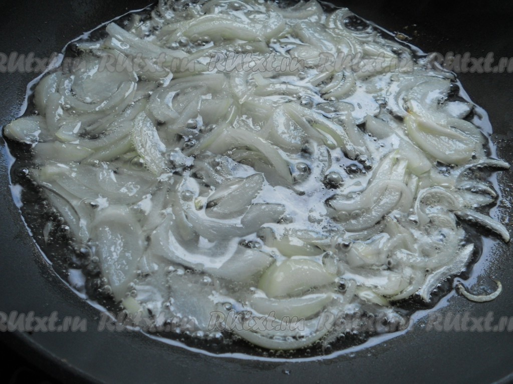 Оставшийся лук нарезать полукольцами, обжарить до прозрачности на растительном масле.