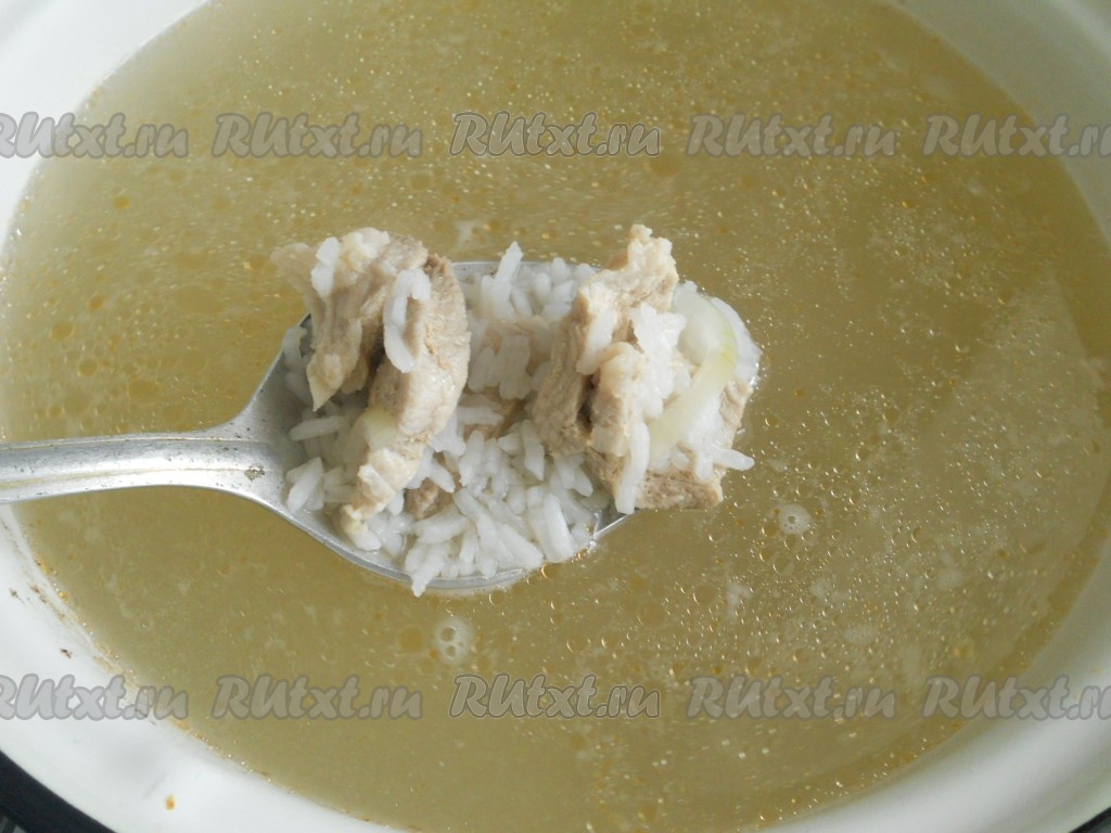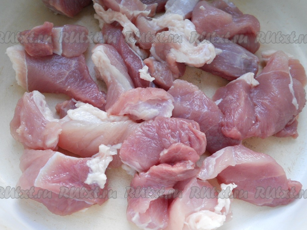 Свинину нарезать небольшими кусочками. Залить водой и поставить на огонь. Довести до кипения, убрать пену. Добавить к бульону половину порезанной тонкими полукольцами луковицы. Посолить по вкусу. Варить до готовности мяса на слабом огне.