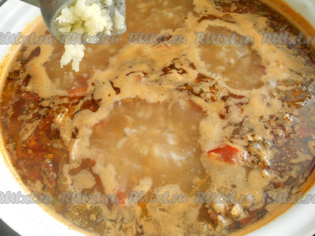 Кипятить харчо из свинины с рисом на слабом огне минут 7-8, после чего добавить лавровый лист и пропущенный через пресс чеснок.